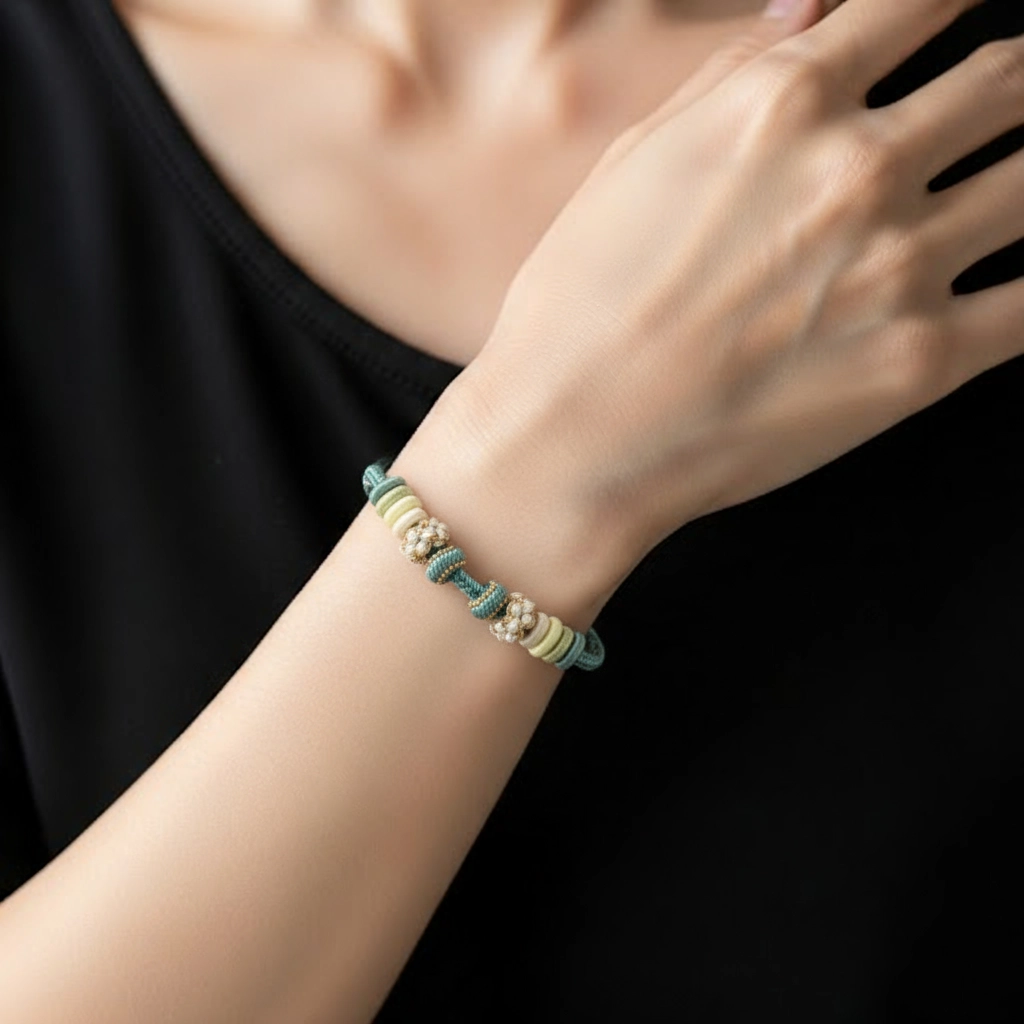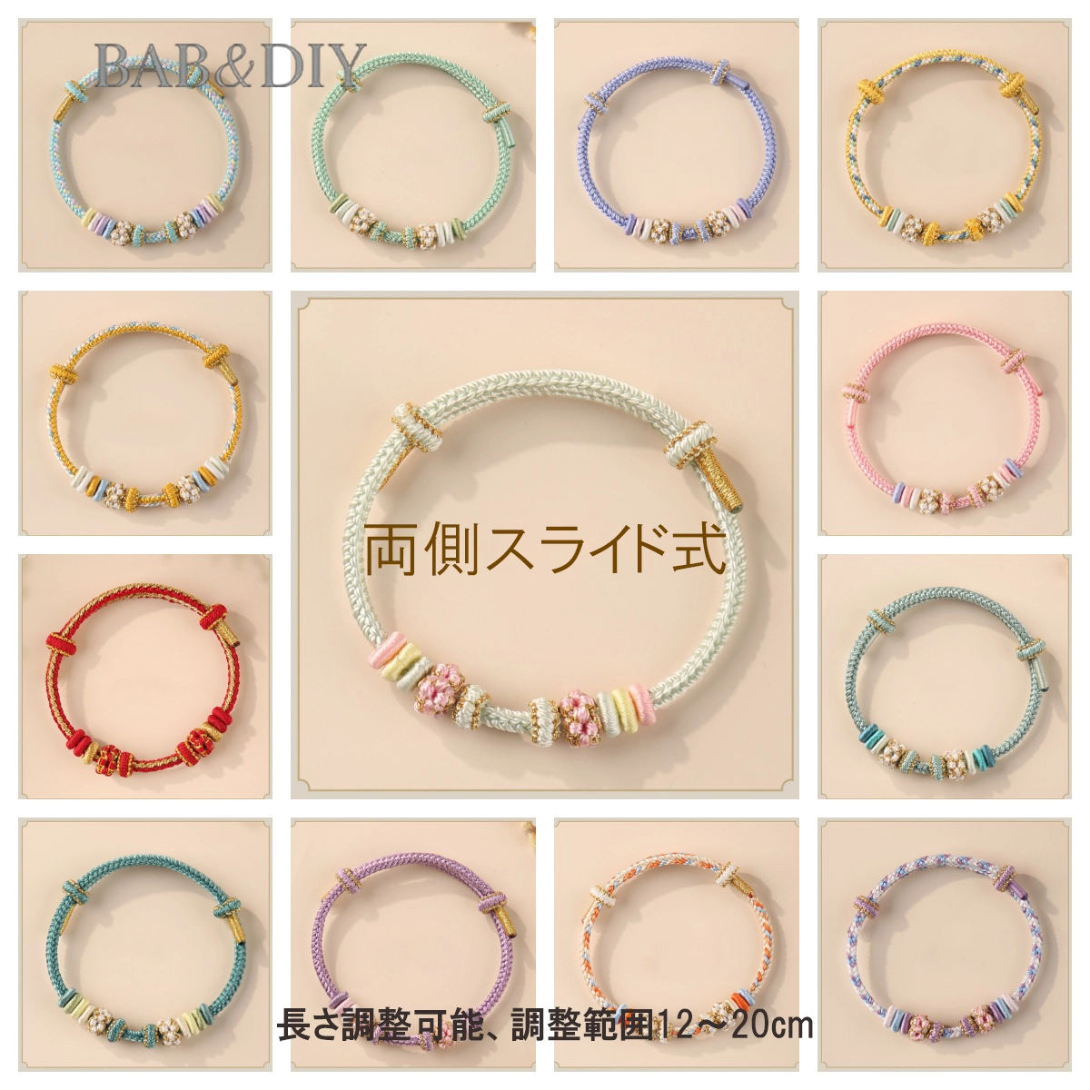 両側スライド式で長さを自由に調節できる、手作りのブレスレットです。カラフルな糸を使用し、丁寧に編み上げています。自分用はもちろん、大切な人への贈り物にも最適です。願い事を込めて着けることで、幸運や祈願のお守りとしてもお楽しみいただけます。